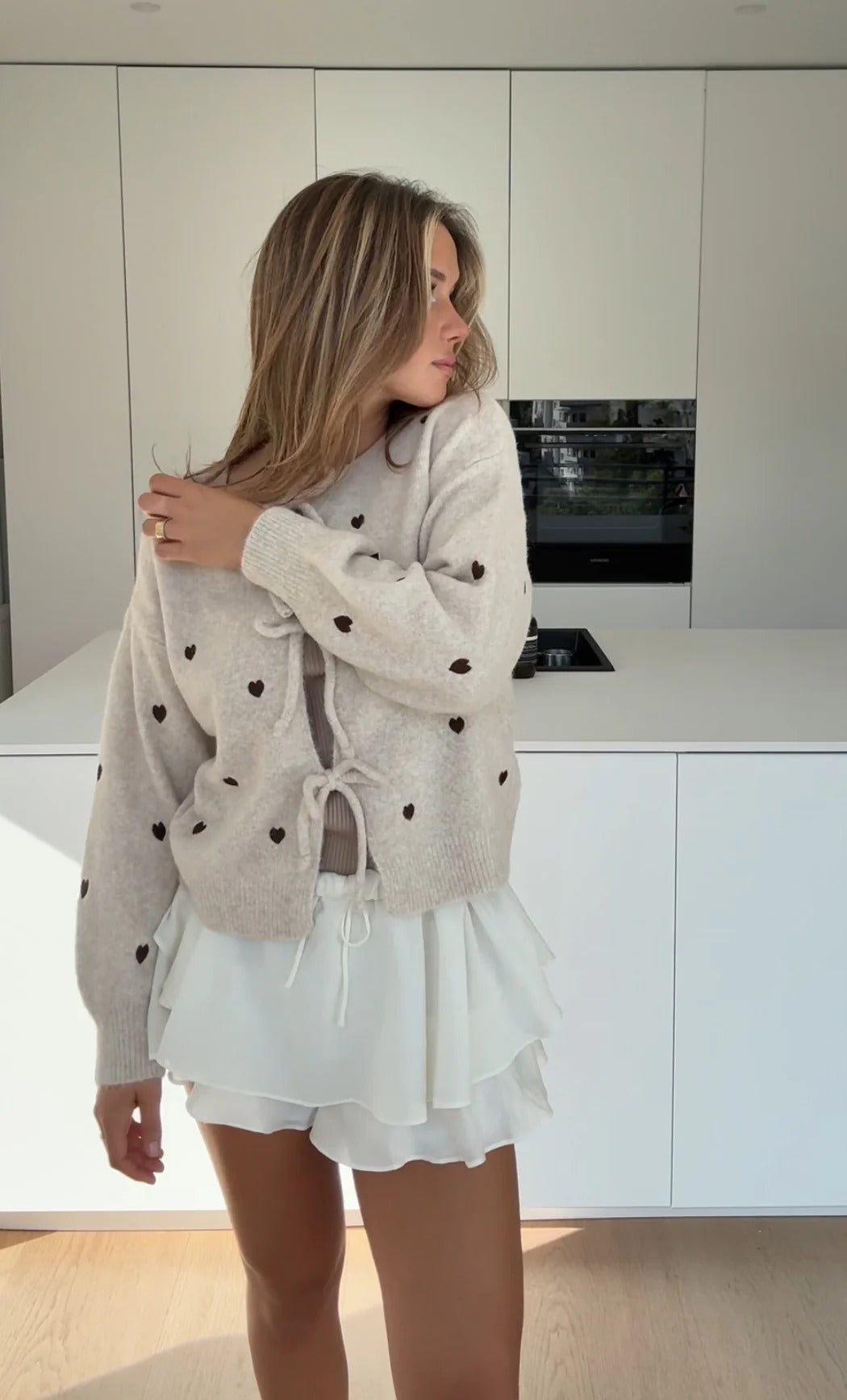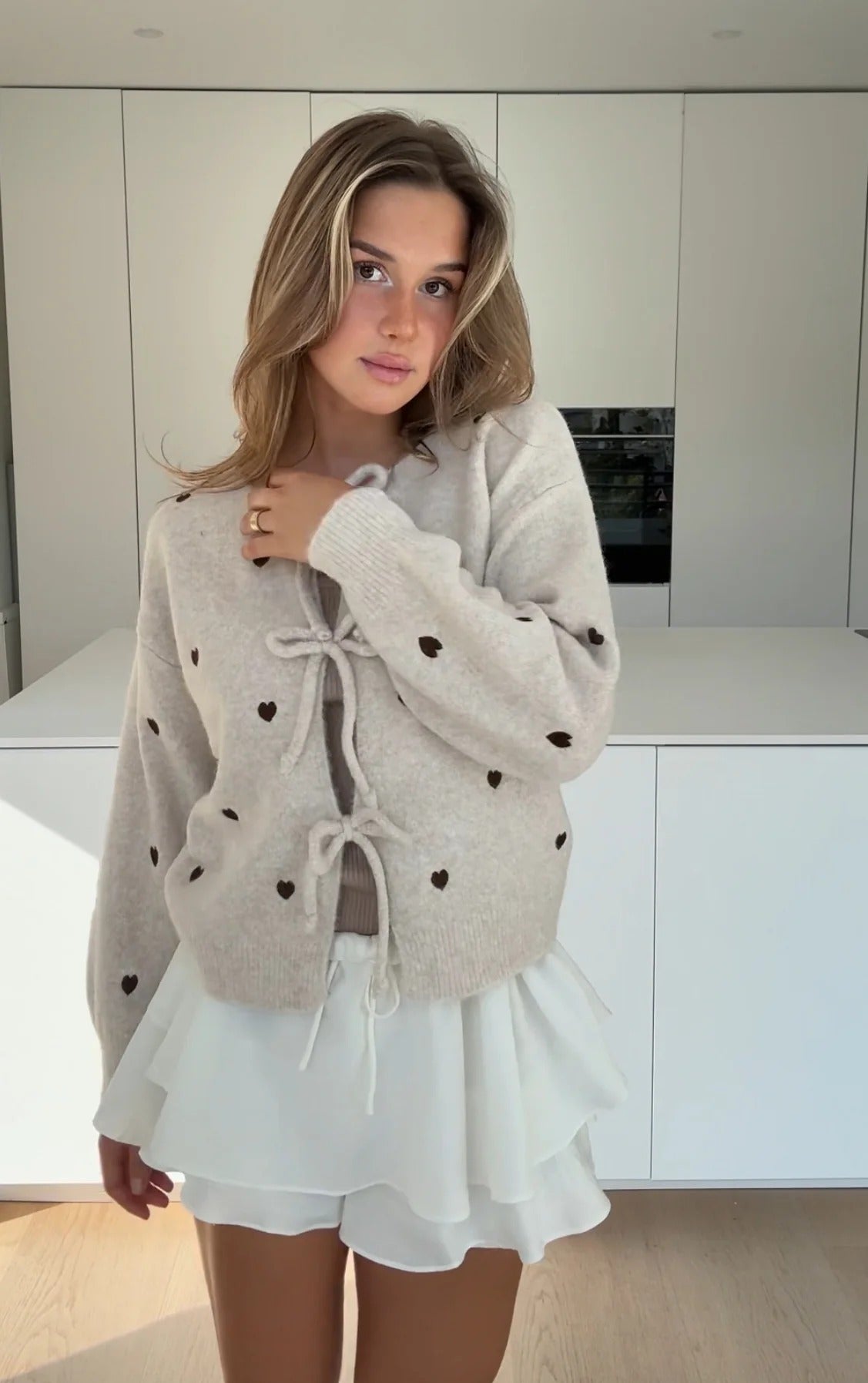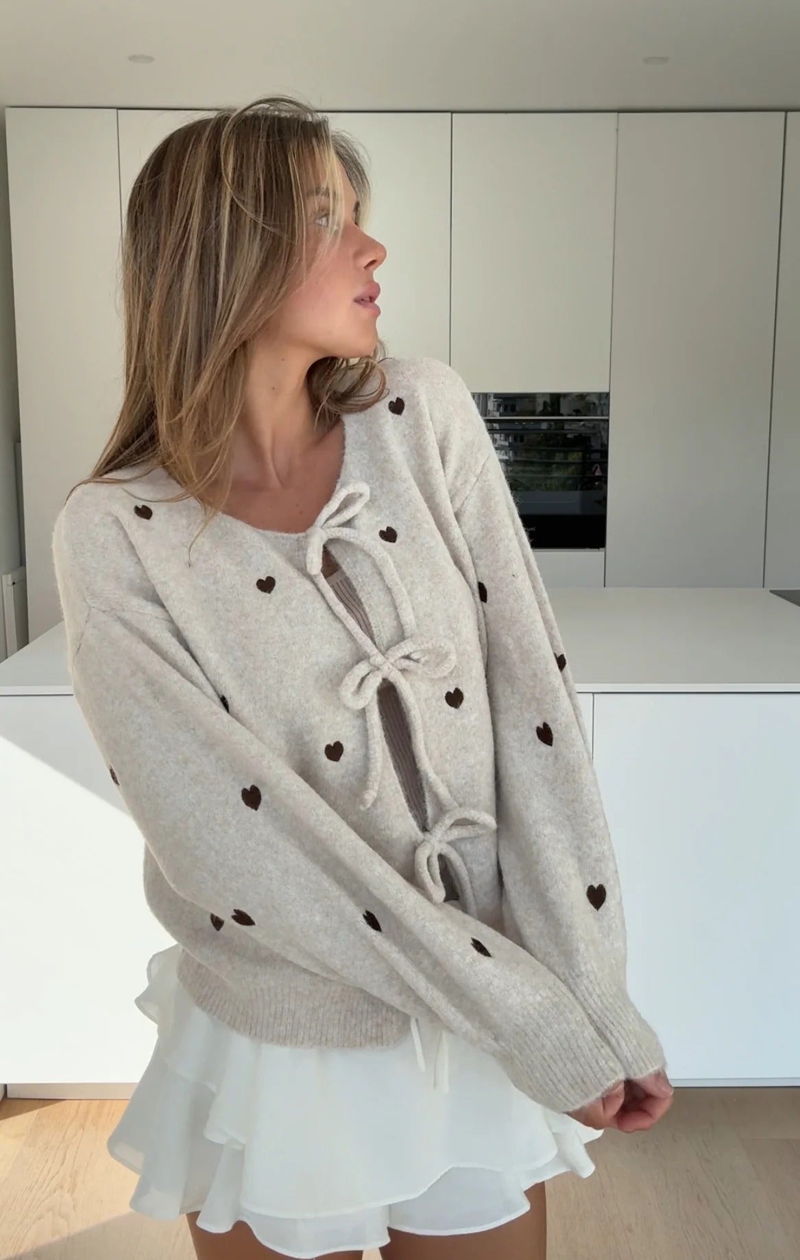 Diseño: Cárdigan de corte relajado con lazo ajustable en la cintura y detalle decorativo de corazón.
