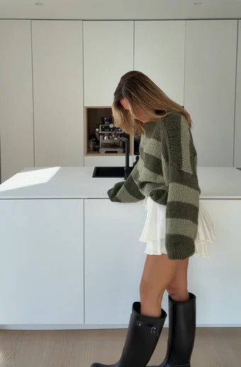 Color: Verde salvia con rayas suaves en tonos neutros. Natural, fresco y fácil de combinar con beige, blanco o tonos tierra.